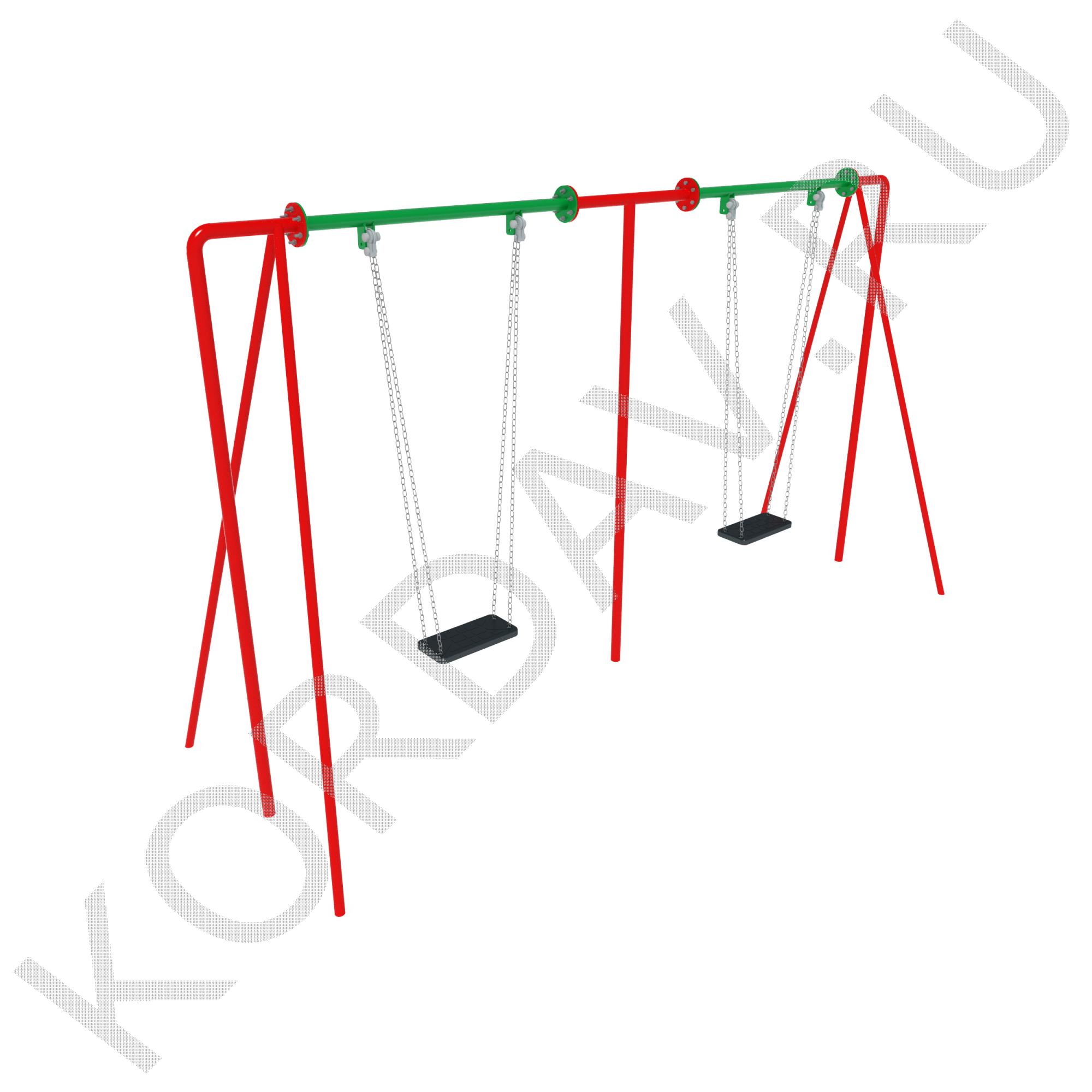Качели предназначены для крепления сразу двух сидений. В основе каркаса качелей лежит трубная конструкция она крепится в семи точках, три трубы крепятся вертикально, а четыре в распор относительно центра конструкции. При установке качелей делаются углубления в грунте, устанавливается конструкция и заливается бетонным раствором.