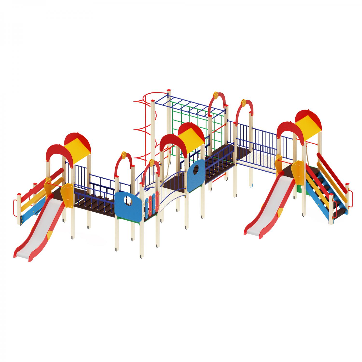 Две горки, три башенки, рукоход, спираль, шведская стенка.